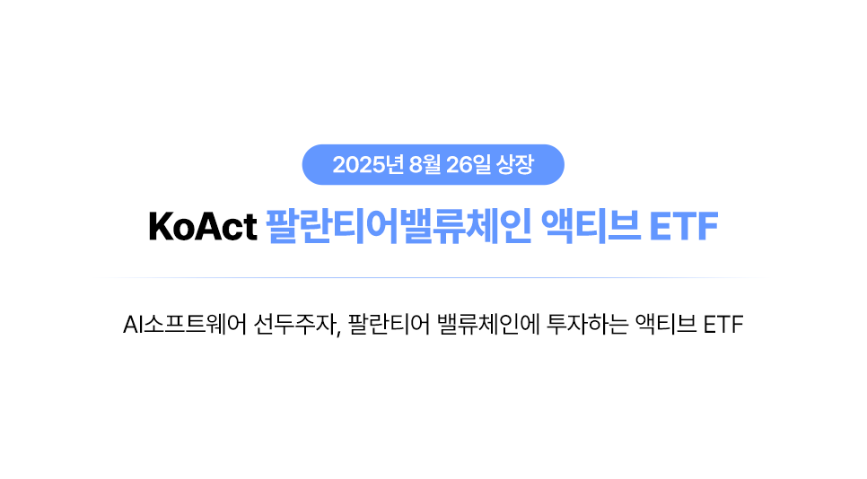 왜, 팔란티어 밸류체인인가?     오늘은 2025년 8월 26일 상장하는 KoAct 팔란티어 밸류체인 액티브 ETF에 대해 알아보는 시간을 가져보려고 합니다.     팔란티어는 높은 기술 경쟁력을 기반으로 AI서비스 산업을 주도하고 있어 넥스트 빅테크 기업으로 주목 받는 기업 중 하나인데요. 특히 AI인프라가 어느 정도 구축된 이후 수년간 이어질 AI서비스 산업의 성장에 발맞춰 ‘팀팔란티어’에 집중 투자하는 전략이 유망하다고 판단됩니다.         팔란티어는 경쟁사들 대비 높은 매출 성장세를 보이며 기업용 AI서비스(엔터프라이즈 AI) 시장을 주도하는 기업 중 하나인데요.     C3.ai, BigBear AI, Accenture, IBM 등 경쟁사들은 2Q25 실적 발표에서 모두 실망스러운 실적을 기록한 것과 다르게 팔란티어는 2Q25 실적 발표(25.08.05)에서 전분기 대비 놀라운 실적 성장세를 보여 주목을 받았습니다.         기업용 AI서비스 산업은 38배 성장 전망!     이번 실적 발표에서 팔란티어는 실제 고객들의 도입 사례를 소개하며 AI서비스 시장의 개화를 알렸는데요.   ​ 씨티은행은 팔란티어 AI서비스 도입을 통해 기존에 9영업일이 소요되던 고객 온보딩 과정을 수초 단위로 단축했으며, 미국 연방주택저당공사(Fannie Mae)는 평균 2달이 소요되던 주택담보대출 사기 발견 프로세스를 수초 단위로 단축했습니다. (출처: Palantir, 2025.08.05)     이처럼 이제는 기업 AI기술을 도입했을 때 명확하게 ROI(투자금 대비 도입 효과)가 나오는 구간에 진입하며 기업들의 AI기술 도입 수요는 증가하고 있는 것으로 보여집니다.   ​ Morgan Stanley에서 100 대 기업 IT 담당 임원(Chief IT Officer)들을 대상으로 진행한 설문조사 결과 IT 프로젝트 중에 우선 순위가 가장 높은 분야는 AI/머신러닝/프로세스 자동화로 나타났습니다.         시장조사업체인 Precedence Research는 팔란티어가 주도하고 있는 기업용 AI서비스 시장이 2024년 145억달러 규모에서 2034년 5,607억달러 규모로 CAGR 44.1% 성장률을 기록하며 38배 이상 성장할 것으로 전망했습니다.         팔란티어와 미국 정부의 관계?     팔란티어는 9/11 테러 이후 CIA, FBI, 미 국방부의 투자로 2003년에 설립된 AI서비스 개발 회사인만큼 미국 정부와도 관계가 깊은데요.​     팔란티어는 여전히 미국 정보 기관들 및 국방부향으로 AI서비스들을 공급 중이며 팔란티어 창업자 피터 틸은 JD밴스 미국 부통령(피터 틸의 벤처케피탈에서 근무), 데이비드 삭스 미국 AI정책 총괄(전 Paypal COO) 등과도 친분이 깊은 것으로 알려져 있습니다. (출처: Fortune, 2025.05)         2025년 7월 23일 미국 정부가 발표한 AI 액션플랜은 팔란티어가 자문했다는 점에서도 향후 미국의 AI 산업 육성 정책의 수혜를 받을 것으로 기대됩니다. (Palantir, 2025.08)         팔란티어와 함께 성장하는 ‘팀 팔란티어’     KoAct 팔란티어밸류체인 액티브 ETF의 가장 큰 장점 중 하나는 팔란티어 단일 종목 뿐만 아니라 팔란티어와 동반성장하는 ‘팀 팔란티어’ 기업들을 적극 발굴하여 투자한다는 점입니다.     팔란티어와 데이터센터 파트너십을 맺은 ▲오라클, ▲알파벳과 더불어 ▲아처에비에이션, ▲에어로바이런먼트, ▲헌팅턴 잉걸스 인더스트리즈 등 팔란티어와 협력 중인 미국 드론, 조선, 방산 기업들까지 투자하여 성과를 적극 추구할 계획입니다.     KoAct 팔란티어 밸류체인 액티브 ETF 포트폴리오         혁신 산업의 Rising Star를 놓치지 말자!     기업용 AI서비스 산업이 극초기 단계에 위치해 있다는 점과 팔란티어가 산업 내 독보적인 경쟁력을 보유하고 있다는 점에서 팔란티어의 투자매력도가 높다고 판단되는데요.     2014년 클라우드 컴퓨팅 산업 초기에 아마존에 투자했다면, 아마존 주가는 이후 클라우드 산업의 성장과 더불어 2014년 1월 대비 2025년 8월, 약 11배 이상 상승했습니다.     향후 10년간 이어질 것으로 기대되는 정AI서비스 산업 사이클에서 삼성액티브자산운용의 AI 서비스 산업 대표 ETF, ‘KoAct 팔란티어 밸류체인 액티브 ETF’와 함께 세상의 미래에 투자하시길 바랍니다.