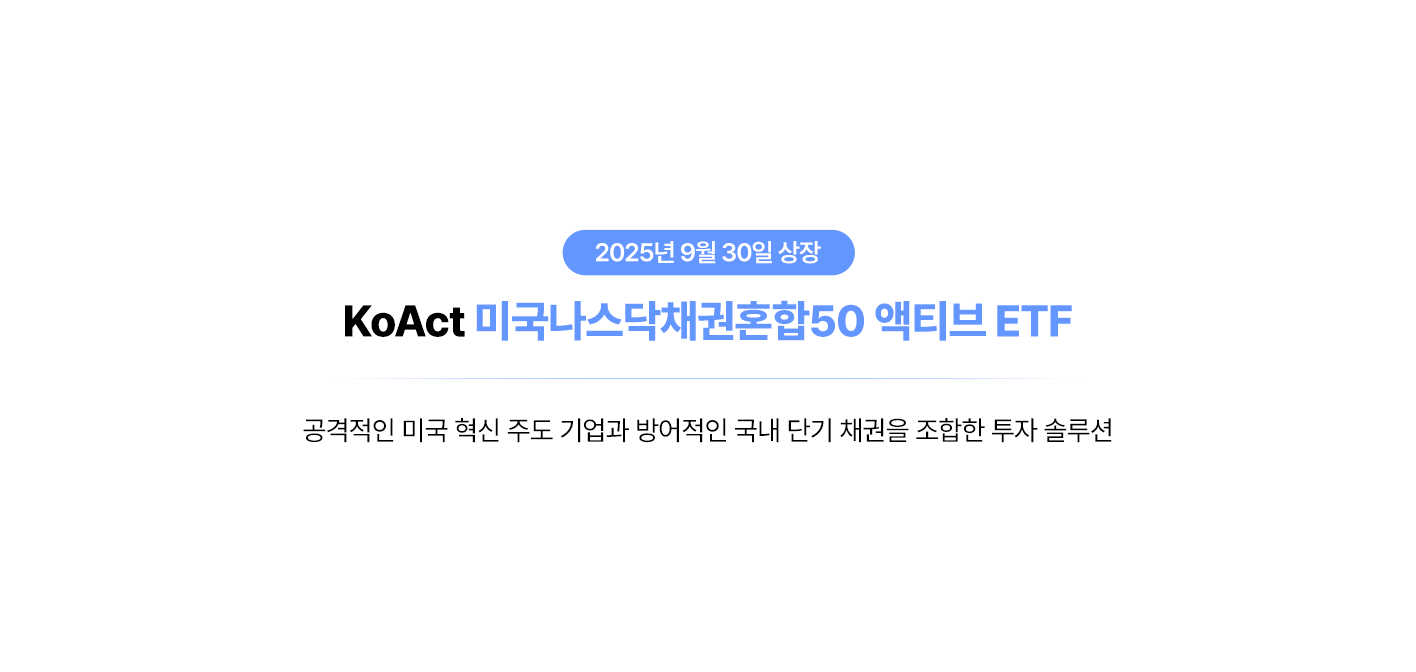 ❙ KoAct 미국나스닥채권혼합50 액티브 ETF 출시     오늘은 2025년 9월 30일 상장하는 KoAct 미국나스닥채권혼합50 액티브 ETF에 대해 알아보는 시간을 가져보려고 합니다.     이미 2025년 초에 상장한KoAct 미국나스닥성장기업 액티브 ETF에 투자하고 계신 분들도 계실 텐데요.     삼성액티브자산운용은 혁신 산업과 기술에 대한 깊이 있는 분석과 발 빠른 대응으로 기존 나스닥 패시브 상품들 대비 초과 성과를 추구합니다.       그리고 드디어, 혁신 기업 투자에 방어적인 채권 포트폴리오를 더해 전반적인 포트폴리오의 안정성까지 확보하고자 하는 투자자들을 위해 준비한 상품이 상장됩니다.     바로 KoAct 미국나스닥채권혼합50 액티브 ETF인데요. 이번 상품은 퇴직연금에서 100%까지 투자가 가능하다는 점에서 혁신 기업 포트폴리오를 극대화하고자 했던 투자자들의 아쉬움까지도 달래 줄 수 있을 것으로 기대하고 있어요.       ❙ 주식 전략: 혁신 기업에 집중 투자       KoAct 미국나스닥채권혼합50 액티브 ETF는 주식 포트폴리오에서 혁신 기업 압축 투자를 지향하는데요. 인터넷의 발전으로 글로벌 시장이 국경을 넘어 하나로 연결되면서 승자독식 구조가 강화되고 있고, 기술 혁신의 속도가 빨라지며 혁신 산업과 전통 산업 간의 실적 성장률 격차는 더 벌어지고 있다고 판단됩니다.       ​혁신 기업들의 이익이 포함되는 S&P500 합산 EPS와 중위 기업 EPS의 격차는 2010년대 초반부터 계속 벌어지고 있으며 향후 펼쳐질 AI 시대에 그 격차는 더 벌어질 것으로 예상합니다.     따라서, AI 시대 승자 중심의 포트폴리오를 추구해 지속적으로 나스닥 지수 대비 초과 성과를 추구할 계획이에요.           편입 종목을 보면 AI 서비스 산업의 대표 주자인 Palantir(기업용 AI 서비스), Tesla(AI 자율주행 및 AI 로봇), Alphabet(AI 서비스 플랫폼) 등을 최상위 비중으로 투자하고 있어 2026년부터 본격적으로 개화될 것으로 전망되는 AI 서비스 시대에 선제적으로 포트폴리오를 맞췄다고 볼 수 있는데요.     ​그 외에 ASIC AI 반도체 기업 Broadcom과 온디바이스AI 사이버 보안 기업 Crowdstrike 등 차세대 혁신 기업들을 다수 포함하고 있고 바이오 혁신 기업으로 전망하고 있는 Gilead(HIV 백신), Alnylam Pharmaceuticals(RNA 기반 유전병 치료제)도 투자할 계획입니다.             ❙ 채권 전략: 꾸준한 금리 수익 추구     채권 포트폴리오는 Kodex 머니마켓 액티브 ETF, Kodex 27-12 회사채(AA-이상) 액티브 ETF 등 국내 우량 채권 ETF/ETN 들에 분산 투자하여 안정적인 수익을 추구합니다.     채권 포트폴리오의 평균 듀레이션은 1년 수준으로 시장 금리 변동에 따른 채권 가격 리스크를 낮췄으며, 회사채/은행채 등을 통해 국채 대비 높은 금리 수익을 추구합니다. 한편, 국내 채권 투자를 통해 환율 변동 리스크를 없앤 것도 방어적 채권 포트폴리오 구축에 있어서 중요한 전략인 거죠.         ❙ 연금 계좌에서 혁신 기업 투자 비중 극대화     자료: 삼성액티브자산운용(2025.09.25) / 상기 내용은 향후 달라질 수 있습니다.   주식형 ETF의 경우 연금 계좌에서 최대 70%까지 밖에 투자할 수 없어서 남은 30%를 어쩔 수 없이 다른 상품에 투자하시는 분들도 많을 텐데요.     그런 투자자분들께 KoAct 미국나스닥채권혼합50 액티브 ETF는 혁신 기업 주식 비중을 늘릴 수 있는 좋은 옵션이 될 수 있다고 판단됩니다.     앞으로 펼쳐질 혁신 기업들의 성장 스토리가 기대되는데요.     삼성액티브자산운용의 혁신 미국주식 + 우량 채권 솔루션, KoAct 미국나스닥채권혼합50 액티브 ETF와 함께 세상의 미래에 투자하시기 바랍니다.