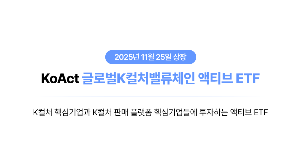 ❙ KoAct 글로벌K컬처밸류체인 액티브 ETF 출시         오늘은 2025년 11월 25일 상장한 KoAct글로벌K컬처밸류체인 액티브 ETF에 대해 알아보는 시간을 가져보려고 합니다.       2025년 6월 20일 넷플릭스를 통해 공개된 케이팝 데몬 헌터스의 글로벌 흥행을 다들 살펴보셨을 텐데요.       관련 밸류체인에 직접적인 투자가 가능한 ETF에 대해 설명해 드리려고 합니다.         자료: 삼성액티브자산운용(2025.11.25) / 상기 내용은 향후 달라질 수 있습니다.         ❙ 투자 전략: 국내 K컬처의 대표주와 해외 플랫폼에 투자       KoAct 글로벌K컬처밸류체인 액티브 ETF는 국내 K컬쳐 대표기업과 한발 더 나아가 안정적인 이익 성장이 기대되는 글로벌 플랫폼 기업들까지 K컬처 밸류체인을 확대하여 투자합니다.       최근 K컬처 관련 기업들이 기대감은 높았으나, 실제보다 안정적인 수익률을 보여주지 못한 것으로 보이는데요. * 그러나 기대감이 낮아진 지금이 오히려 기회가 될 수 있을 것으로 보이기도 하죠. *CJ ENM, 스튜디오 드래곤 등 콘텐츠 제작 기업들의 YTD 코스피 대비 수익률 언더퍼폼 (출처: DataGuide, 기준일: 25.11.21)       K-Pop 의 경우에는 글로벌 인지도를 구축했지만, 실제 시장에서의 매출 성장은 시작 단계로 보이는데요. K-Pop 의 글로벌 음원 시장 내 점유율이 아직 2%에 불과하기 때문입니다.* *출처: IFPI, 빌보드, 기준일: 25.11.10       2026년에는 BTS, 블랙핑크, 빅뱅 등 글로벌 인지도가 높은 아티스트들의 활동이 재개될 것으로 예상되는 만큼 지금보다 더 큰 잠재시장이 열릴 것으로 기대해 봅니다.       K-뷰티와 K-푸드도 글로벌 시장에서 존재감을 드러내고 있습니다.* K컬처의 높아진 위상이 한국기업의 실제 매출과 이익 성장으로 연결되기 시작할 것으로 기대하고 있어요. * Costco: 실적발표 컨퍼런스 콜 한국 브랜드 입점 확대 시사, Ultra Beauty: K-beauty 브랜드 확대 언급 (25.12.05)       KoAct 글로벌K컬처밸류체인 액티브 ETF는 앞으로 세계로 뻗어갈 K-Pop, 푸드, 컨텐츠, 뷰티, 웹툰의 영역에서 브랜드력을 바탕으로 이익 성장이 기대되는 기업뿐만 아니라, 글로벌 K컬처가 활용되고 있는 글로벌 플랫폼까지 직접적으로 투자하여 K컬처 밸류체인 전반에 걸친 투자가 기대되는 ETF입니다.       또한, 이번 상품의 경우 국가 및 산업 매력도에 따라 액티브한 국가별 투자 비중 변화를 통해 안정적인 성과 추구가 가능할 것으로 예상됩니다.  *상기 내용은 향후 달라질 수 있습니다.            자료 : 삼성액티브자산운용 (2025.11.25) / 상기 내용은 향후 달라질 수 있습니다.         ❙ 투자 전략: 진정한 수혜가 기대되는 기업에 투자      25년 6월 20일 공개된 케이팝 데몬 헌터스의 대성공에도 불구하고 직접적인 수혜를 받은 국내 기업은 많지 않았습니다.*      케이팝 데몬 헌터스는 한국을 중심으로콘텐츠가 제작되었고 국내 IP 산업의 이정표가 된 작품으로 평가받고 있는데요.     넷플릭스 최초로 3억 뷰를 돌파**하고, 수록곡 Golden이 빌보드를 포함한 글로벌 음원 차트를 석권했음에도 불구하고 국내 기업의 수혜는 크지 않았다는 평가입니다.     오징어 게임, 케데헌 등 국내 IP의 글로벌 흥행성이 증명된 만큼 K컬처 글로벌 확산으로부터 K-Pop, K-Food, K-Beauty, K-Contents, 글로벌 플랫폼 산업 내 진정한 수혜를 기대할 수 있는 확실한 브랜드력을 보유한 기업을 중심으로 투자할 예정입니다.  *출처: Netflix, 기준일: 25.12.08 / 제작사·배급사 모두 국내 기업 부재하여 실질적인 매출 및 이익 발생 기업 없음/  상기 내용은 향후 달라질 수 있습니다.  **출처: Netflix Tudum, 기준일: 25.09.17          자료: 관세청, Dataguide, Youtube, 삼성액티브자산운용 / 상기 내용은 향후 달라질 수 있습니다.         ❙ 투자 전략: 과점 시장이 형성된 기업에 투자      영상 콘텐츠 밸류체인은 기존 콘텐츠 제작에서 스트리밍 중심으로 이동하며 OTT 플랫폼이 변화의 중심이 되었습니다.     글로벌 플랫폼들의 비즈니스 모델이 기존 광고 중심의 모델에서 구독료 + 광고 비즈니스 모델로 바뀌며 K-Pop, 웹툰, 게임 등 한국 IP를 활용한 인기 콘텐츠 도입이 확대됨에 따라 K컬처 확산에 따른 수혜를 기대할 수 있을 것으로 보입니다.     또한, 글로벌 플랫폼 기업들의 독과점적 시장 구조로 향후 수익성 개선은 가속화될 가능성이 높은 것으로 판단하고 있어요.        자료: Netflix, Spotify, 삼성액티브자산운용 / 상기 내용은 향후 달라질 수 있습니다.          ❙ KoAct 글로벌K컬처밸류체인 액티브 ETF 포트폴리오    자료: Factset, 삼성액티브자산운용 / 2025년 12월 05일 기준※ 총 종목 수는 27 종목  ※ 구성 종목 및 비중은 추후 변경될 수 있습니다.      K컬처와 글로벌 플랫폼 간의 비중, 그리고 K컬처 내에서도 K-Pop, 푸드, 뷰티 등의 비중을 액티브하게 조절하여 알파 수익을 추구할 수 있도록 노력하겠습니다.     KoAct와 함께 세계로 펼쳐 나갈 K컬처의 글로벌 성장 스토리에 투자해 보는 건 어떨까요?
